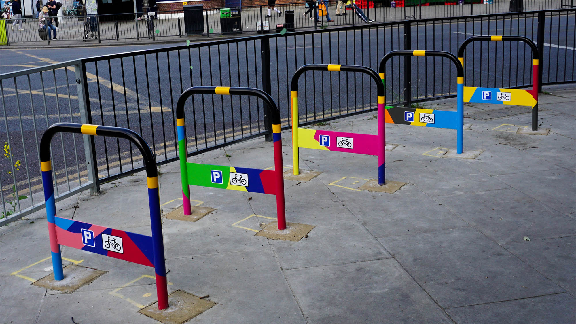After the final artworks were designed Bud Studio along with local junior artists installed the artworks. The outcome was one large scale artwork on the side of Wood Green Library measuring 26m x 22m; 10 newly installed painted bike racks